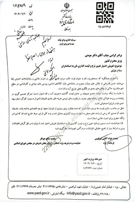 در اقدامی برای حل چالشهای جدی نانوایان و جلوگیری از بحران در تأمین قوت غالب مردم، دکتر محمدصالح جوکار طی نامهای به وزیر کشور، خواستار تفویض اختیار تعیین نرخ نان به استانداران شد و این پیشنهاد راهبردی، با دستور وزیر، رسماً وارد فرآیند بررسی کارشناسی در وزارت کشور شد.